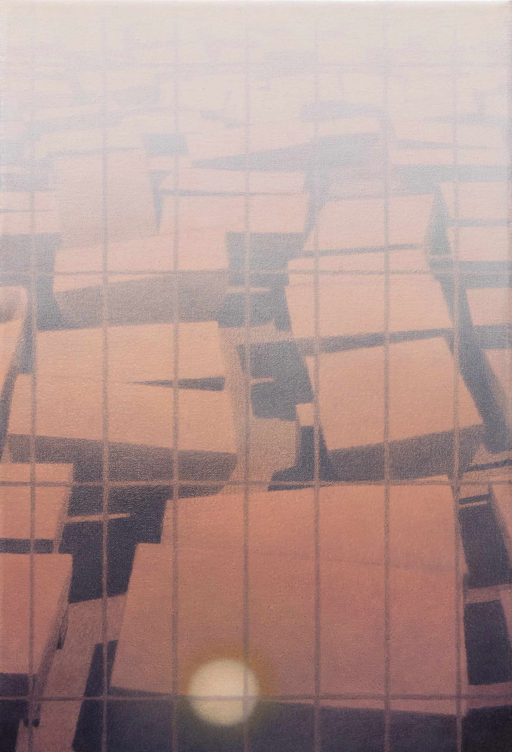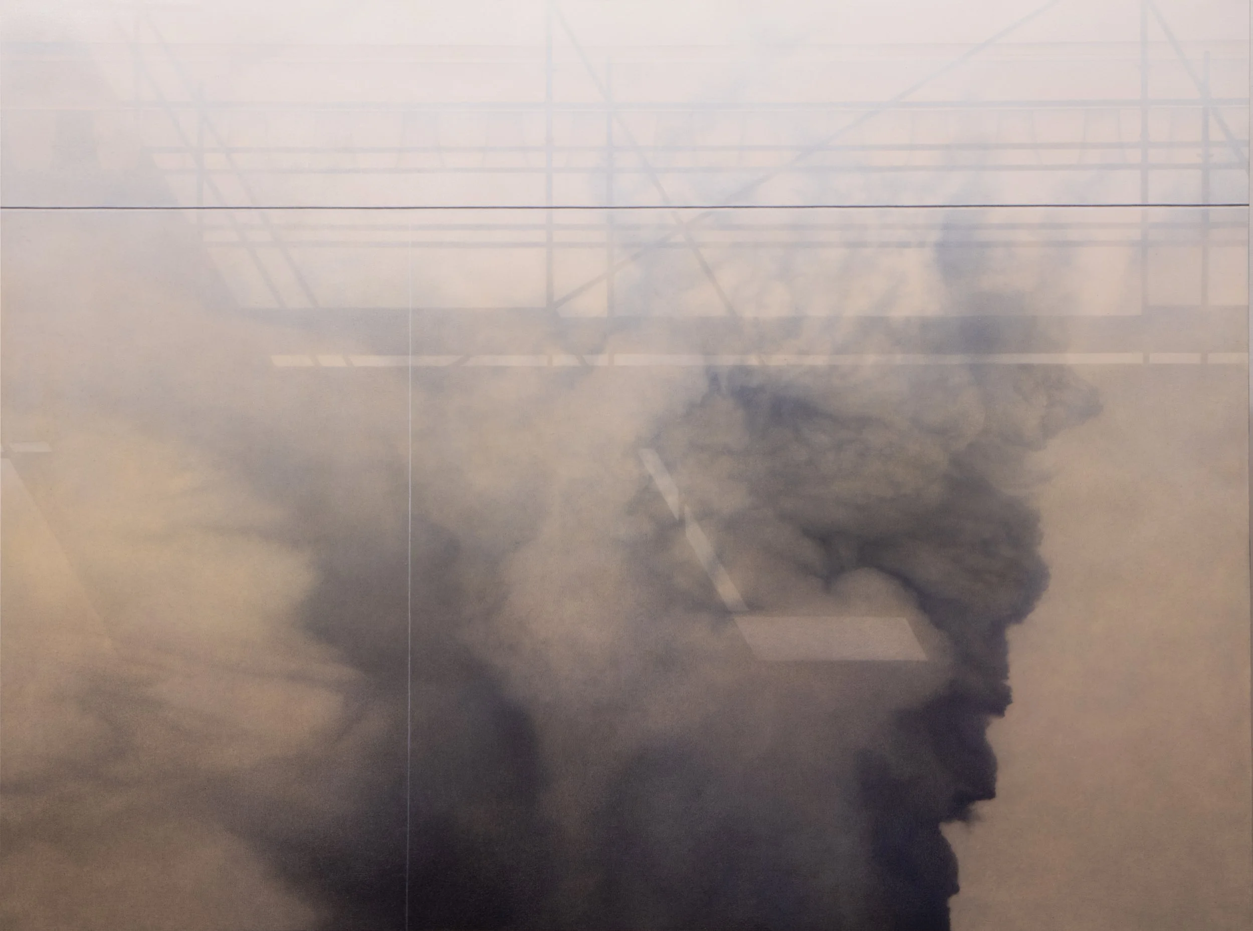 Il lavoro di Laura Omacini si sviluppa attorno a una costante indagine sulla marginalità, intesa come riflessione degli spazi liminali che impediscono, in parte, la libera circolazione all’interno del paesaggio. Cantieri, impalcature e siti di lavoro diventano così i soggetti privilegiati della sua pittura: strutture provvisorie e transitorie, che segnano il territorio e ne rivelano le fragilità. Ad interessare l’artista sono soprattutto quei confini che sono ancora attraversabili, ma solo in modo difficoltoso e precario.