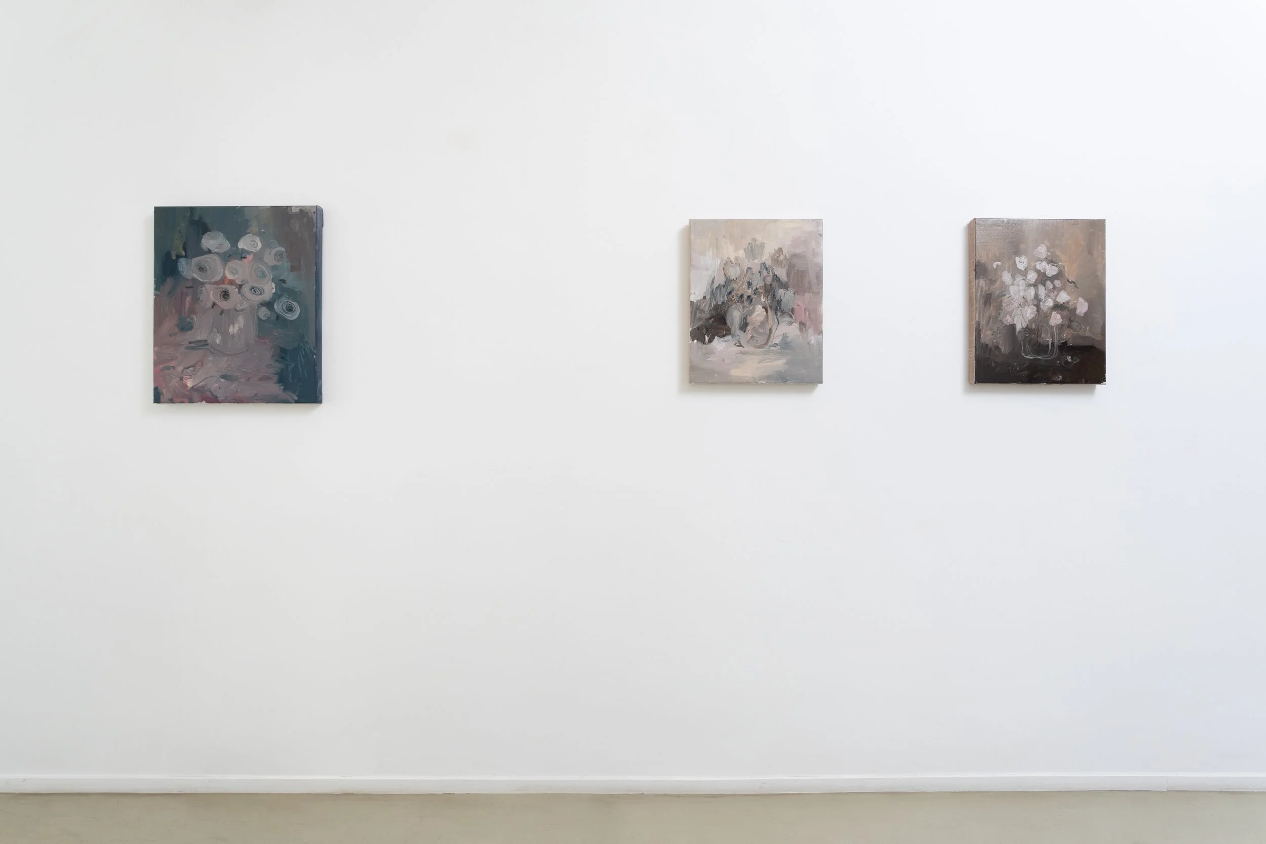 Le radici compositive libere, tipiche del Capriccio, trovano terreno fertile anche lungo il percorso della mostra: ci si imbatte così in fiori dalle tonalità cenerine recisi e ben disposti in vasi e in grandi tele che dalle gradazioni del blu plumbeo passano al verde più acceso; nature esterne, inaspettatamente abitate da fenicotteri o, al contrario, interne dove le uniche presenze sono libri. Ci sono poi le palme che si stagliano nella golden hour, vasche che propagano un azzurro abbacinante e c’è un'unica figura umana, ritratta in una notte, persa ma rischiarata dalle magiche iridescenze di una mirror ball da discoteca.