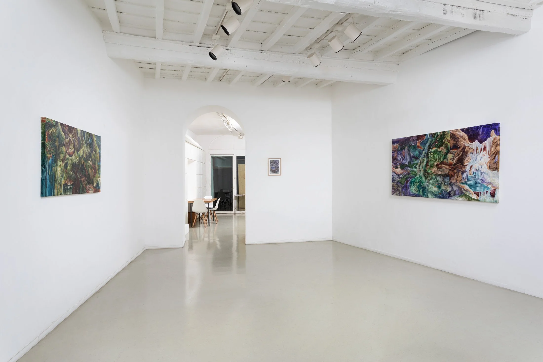 La grotta funge da mondo dentro ad altri mondi, casa primordiale per uomini primordiali - come dimenticare i dipinti preistorici sui muri delle grotte in Spagna e Francia. Gli uomini sono tuttavia assenti nei dipinti di Alice Faloretti, forse siamo invitati a rapportarci con questi scenari profondi e misteriosi senza essere influenzati da esperienze terze, potendoci concentrare